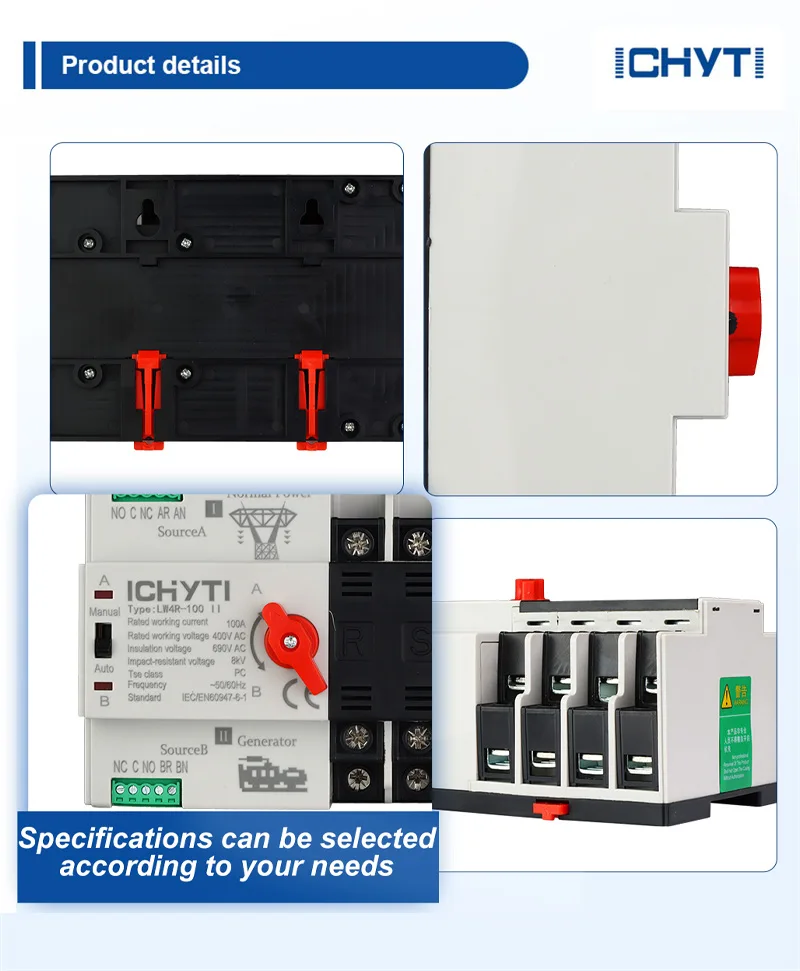 China Factory ICHYTI Veľkoobchod Kúpiť Zľava jednofázový automatický prepínač má tri spínacie funkcie v systéme napájania trojfázovej štvorvodičovej napájacej siete, vrátane automatického prepínania pohotovostného napájania, záložného zdroja a elektrickej siete a generátora. Dokáže zistiť efektívnu hodnotu trojfázového napätia a efektívnu hodnotu fázového napätia a fázu dvoch zdrojov energie v reálnom čase a automaticky prepínať z abnormálnych zdrojov energie na normálne zdroje energie v prípade prepätia, podpätia alebo straty fázy v ktorejkoľvek fáze.